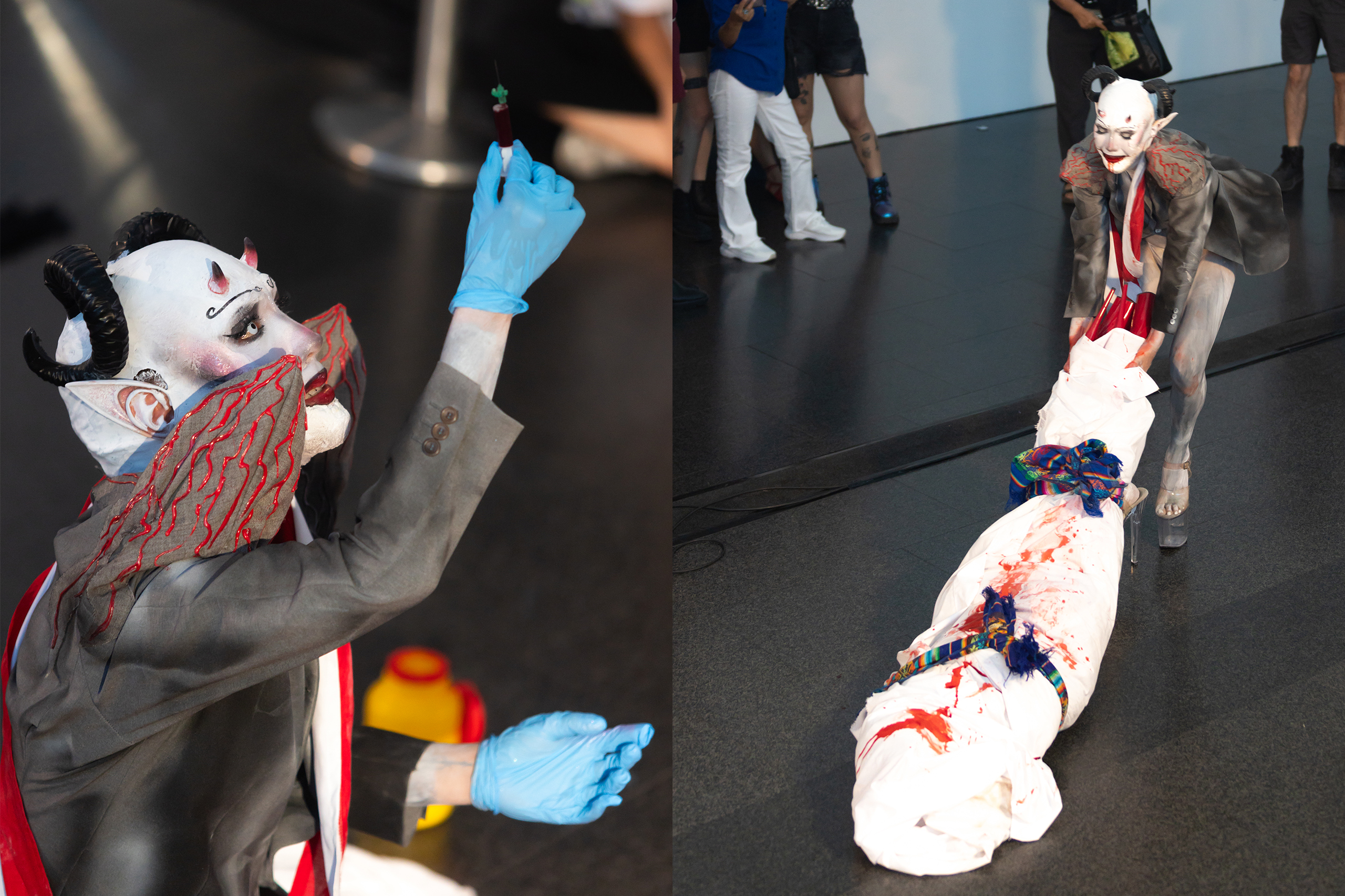 The performance establishes an allegory between HIV, sex work, precaritization, racialization, gender, and death—not as destiny, but as a condition imposed by the structural neglect of national institutions such as the Peruvian state. The “buh,” as HIV is named within trans communities in Peru, appears here as a virus crossing the museum’s membrane in order to infect it.